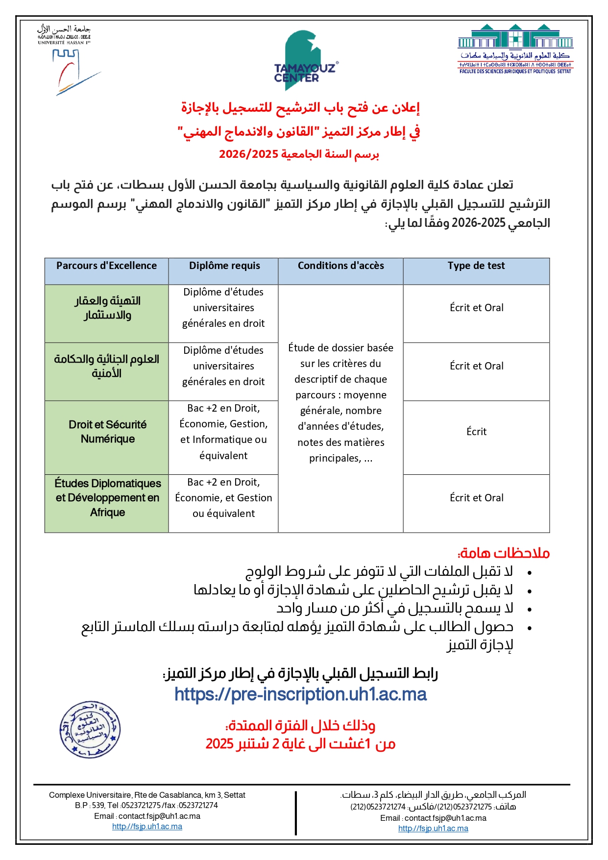 تعلن عمادة كلية العلوم القانونية والسياسية بجامعة الحسن الأول بسطات، عن فتح باب الترشيح للتسجيل القبلي بالإجازة في إطار مركز التميز القانون والاندماج المهني برسم الموسم الجامعي 2025-2026 :