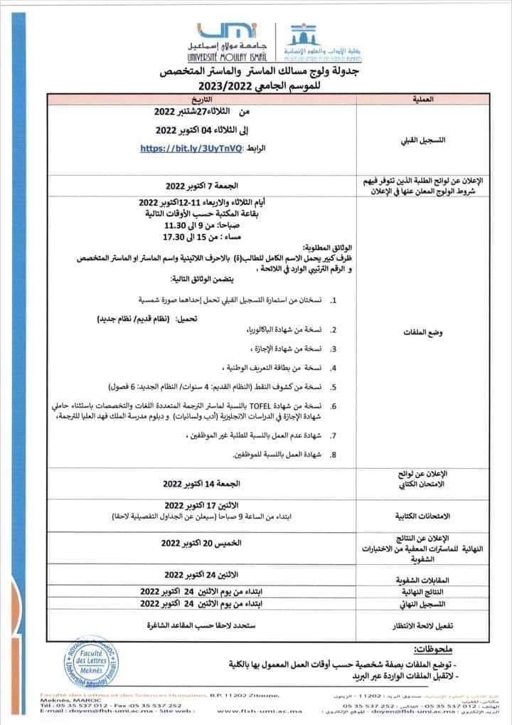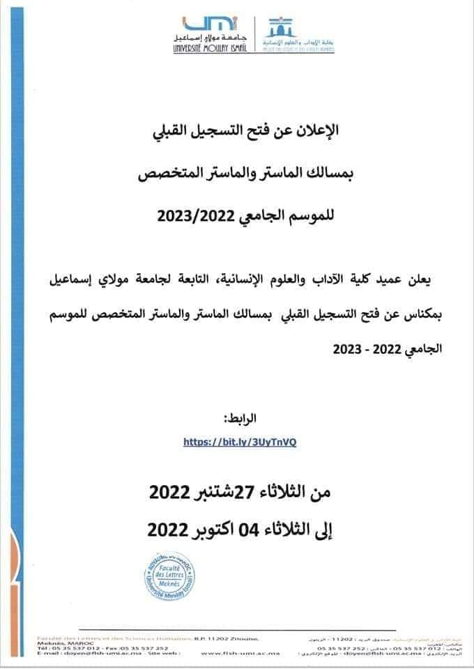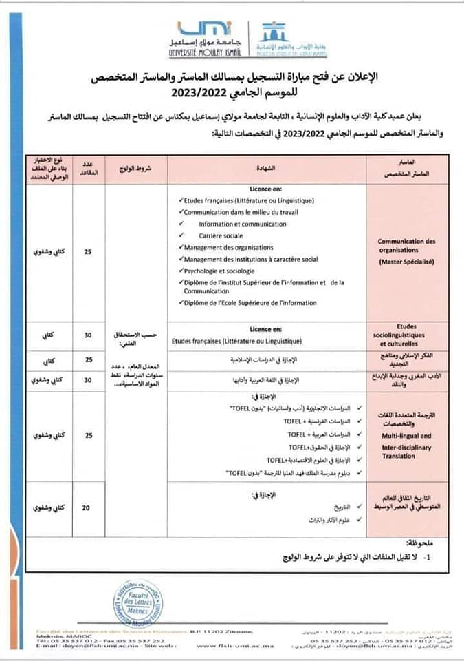 concours d'accès aux masters et masters spécialisés à la flsh meknès 2021-2022