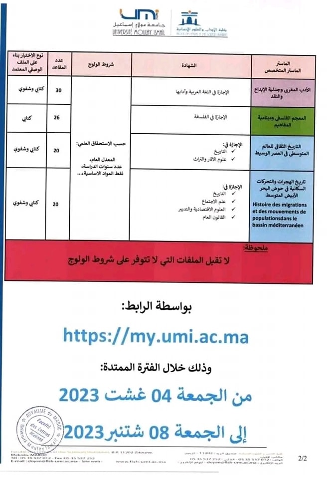 concours d'accès aux masters et masters spécialisés à la flsh meknès 2022-2023