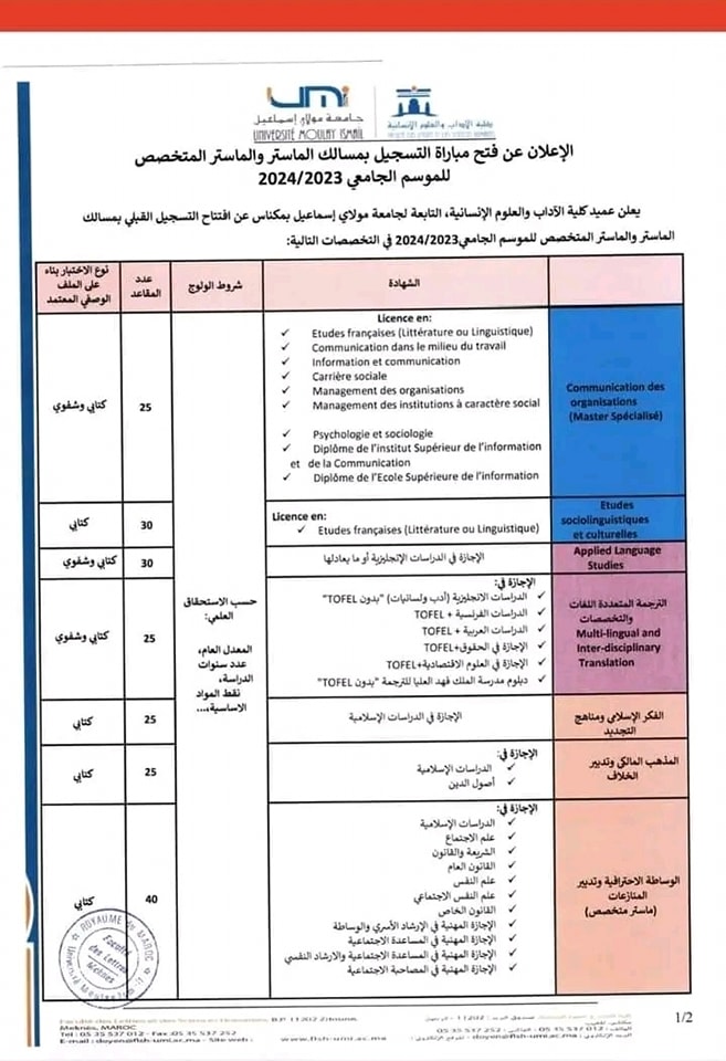 concours d'accès aux masters et masters spécialisés à la flsh meknès 2021-2022